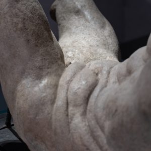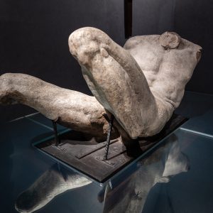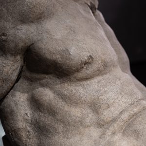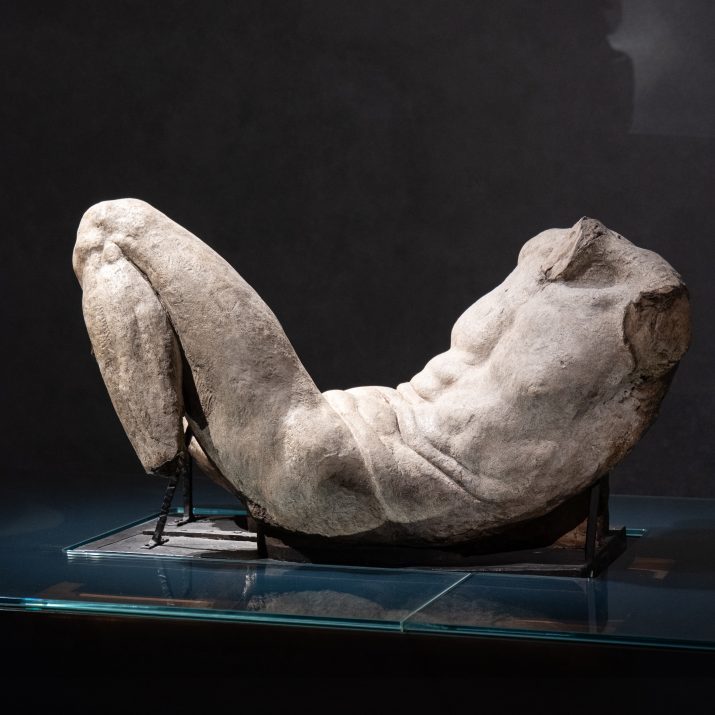 L’opera più preziosa proprietà dell’Accademia, il Dio Fluviale di Michelangelo, ha vissuto una storia particolare, che merita di essere raccontata. Si tratta di un grande modello in terra cruda ovvero argilla, realizzato da Michelangelo attorno al 1525, nel periodo in cui stava lavorando al complesso della Basilica di San Lorenzo a Firenze. Raffigura un vecchio disteso supino, grande poco più del vero, con il busto sollevato, mancante della testa, di parte delle braccia e delle gambe: non perché le abbia perse, ma perché era stato realizzato così. Rispondeva alla iconografia degli Dei Fluviali, figure di vecchi che rappresentavano dei Fiumi, intesi come sorgenti di vita e origini del mondo, assai diffusa nell’antichità classica greca e romana. Era uno dei due modelli citati dalle fonti dell’epoca, che Michelangelo aveva realizzato di sua mano perché gli servissero come guida per delle statue in marmo, che aveva progettato di realizzare ai piedi dei due monumenti funebri esistenti nella Sagrestia Nuova di San Lorenzo, quelli di Giuliano dei Medici Duca di Nemours e di Lorenzo dei Medici Duca di Urbino. Le statue in marmo non furono mai eseguite, e la sopravvivenza di uno dei due modelli è da considerare un evento straordinario, perché normalmente questi manufatti, eseguiti in materiale effimero, non erano destinati a durare e non sono sopravvissuti, con pochissime eccezioni. Il nostro modello, rimasto nella Sagrestia Nuova quando Michelangelo nel 1534 si trasferì a Roma (da dove non sarebbe mai più tornato a Firenze), era proprietà del Granduca Cosimo I dei Medici, che poi lo donò a Bartolomeo Ammannati, suo architetto (Ponte a Santa Trinita) e scultore (Fontana del Nettuno in Piazza Signoria). Il 28 aprile 1583, Bartolomeo Ammannati a sua volta lo donò generosamente all’Accademia delle Arti del Disegno, “a benefizio dei giovani che volevano studiare”.