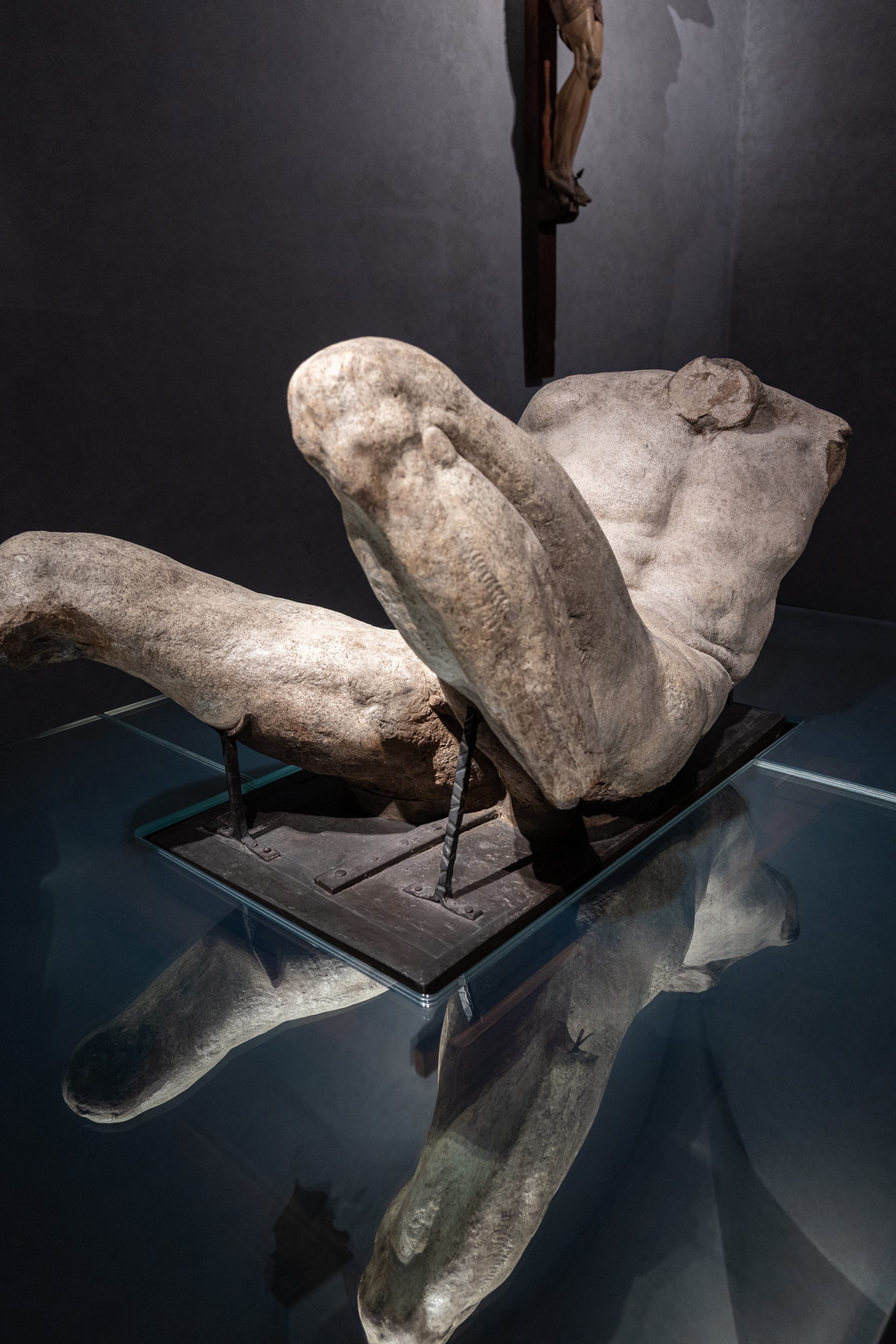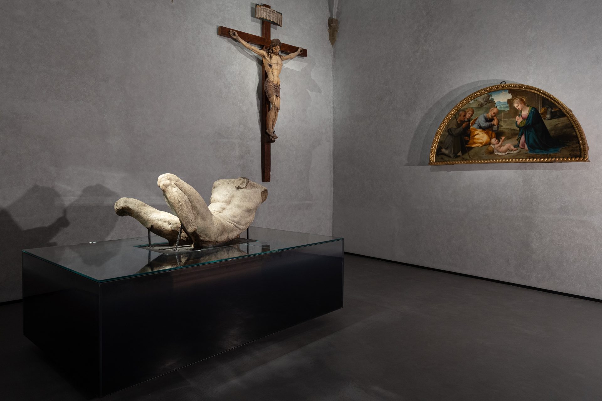 Le altre due opere in questa Sala, conferite all’Accademia fino dagli inizi dell’Ottocento, sono di artisti che sono stati in stretto contatto con Michelangelo. La Lunetta con l’Adorazione dei Pastori (c.ca 1500) è opera del pittore Francesco Granacci, amico di Michelangelo fin da quando da ragazzi studiavano insieme per diventare artisti. E’ stata restaurata di recente, così come il Crocifisso ligneo della Bottega dei Sangallo (c.ca 1510 – 1520), famiglia di scultori e architetti, che è stato trasferito recentemente nella Sala del Dio Fluviale dalla Sagrestia della Cappella di San Luca. E’ uno dei pochi esemplari conservati di grandi dimensioni creati nella Bottega dei Sangallo, e certamente il più bello. Si tratta di un’opera di qualità straordinaria, e di eccezionale stato di conservazione, rivelato nel restauro rimuovendo una coloritura scurissima.